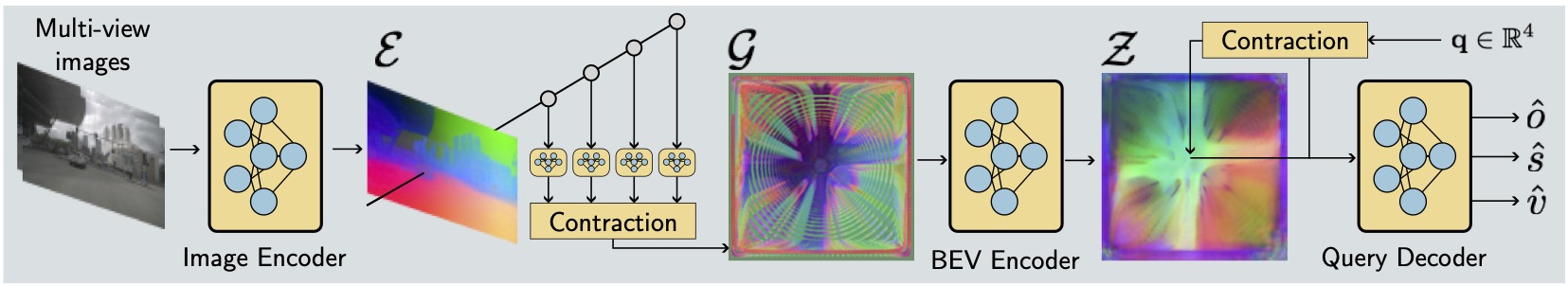The pipeline has four stages: (1) a standard image encoder extracts per-view features, (2) a Lift–Contract–Splat module lifts them into a BEV representation, (3) ResBlocks and deformable attention process the BEV features, and (4) a lightweight decoder answers arbitrary 4D queries from the resulting feature map.